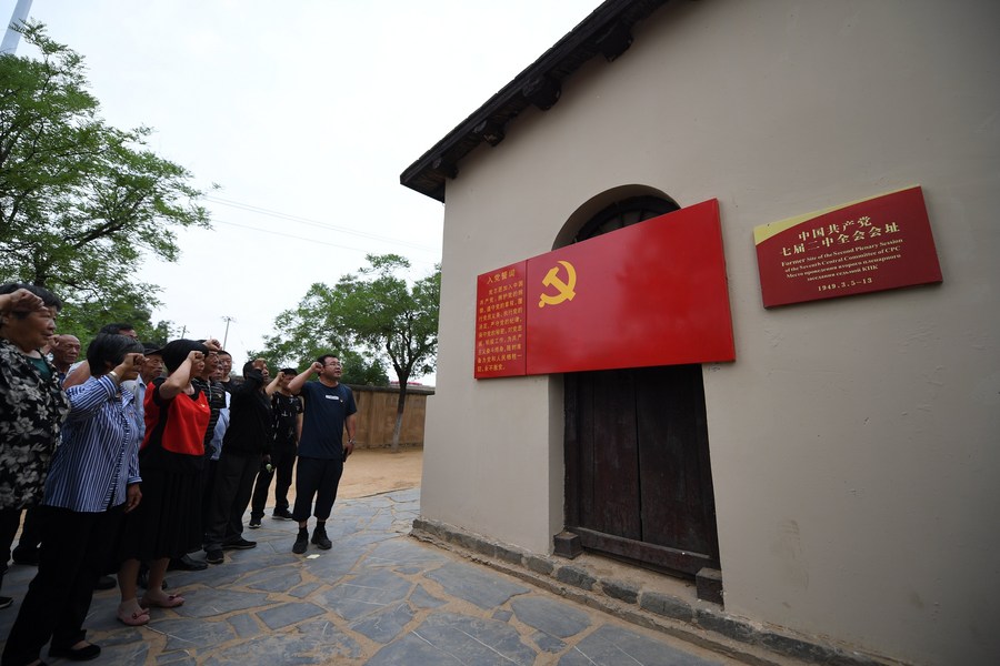 Members of the Communist Party of China (CPC) review the oath of the CPC when visiting the site of the Second Plenary Session of the 7th CPC Central Committee in Xibaipo, north China's Hebei Province, June 20, 2019. (Xinhua/Zhu Xudong)