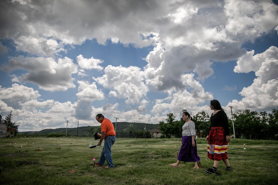 Members of the Cowessess First Nation do a ceremonial smudge at the site of unmarked graves near a former indigenous residential school in Saskatchewan, Canada, on June 27, 2021. (Photo by Amru Salahuddien/Xinhua)
