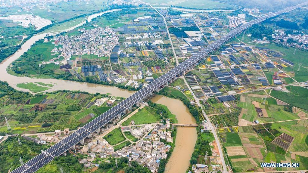 Aerial photo taken on June 28, 2021 shows the Huishui Bridge of the Duyun-Anshun expressway in southwest China's Guizhou Province. The Duyun-Anshun expressway was put into operation on Monday. It is the first section of the 276-kilometer-long national expressway G7611 linking Duyun with Shangri-La. (Xinhua/Tao Liang)