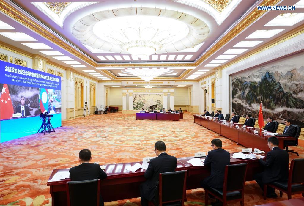 Wang Yang, a member of the Standing Committee of the Political Bureau of the Communist Party of China Central Committee and chairman of the Chinese People's Political Consultative Conference National Committee, meets with president of the Lao Front for National Construction (LFNC) Sinlavong Khoutphaythoune, who is also a politburo member of the Central Committee of the Lao People's Revolutionary Party (LPRP), via video link in Beijing, capital of China, June 29, 2021. (Xinhua/Yan Yan)