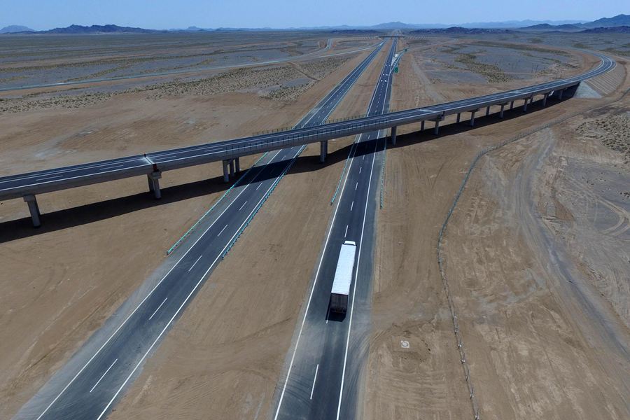 The expressway linking the Chinese capital Beijing and Urumqi, the regional capital of Xinjiang, has a total length of 2,800 km, with over 500 km passing through desert and no man's land.
