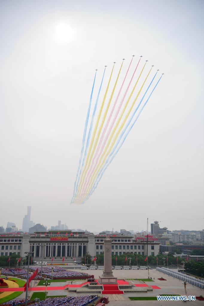 Military aircraft fly over Tian'anmen Square in echelon ahead of a grand gathering celebrating the Communist Party of China (CPC) centenary in Beijing, capital of China, July 1, 2021. (Xinhua/Li Tao)