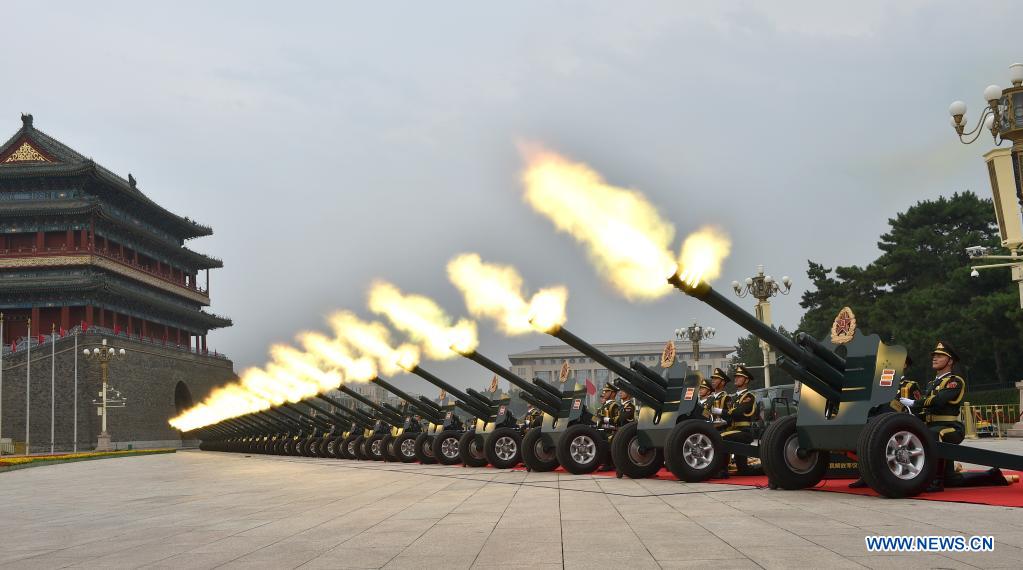 A gun salute is fired during a ceremony marking the centenary of the Communist Party of China (CPC) at Tian'anmen Square in Beijing, capital of China, July 1, 2021. (Xinhua/Meng Tao)