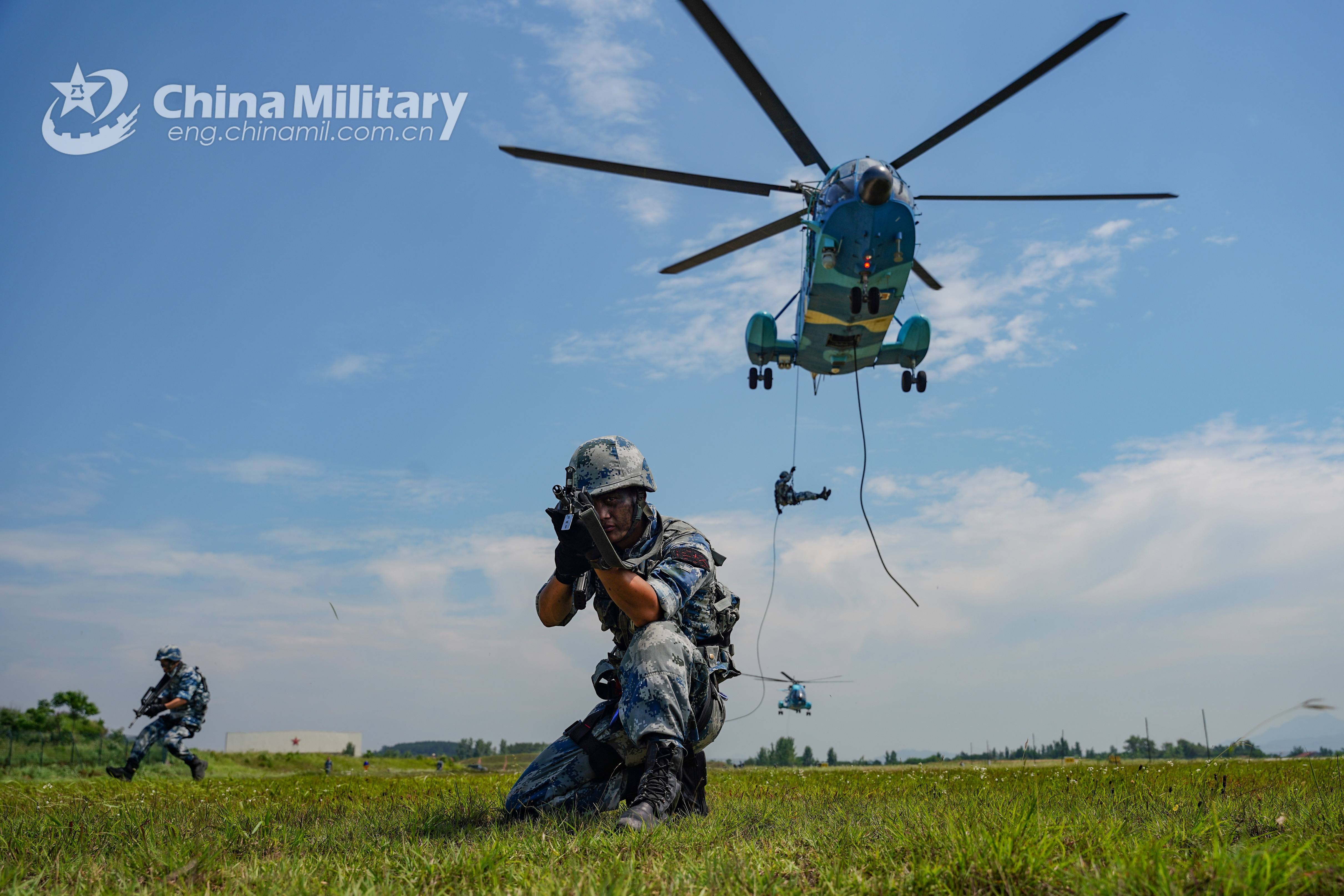 Airmen assigned to the PLA Air Force's airborne troops practice exiting the transport helicopter during a recent fast-roping exercise designed to advance airborne interoperability among the troops in central China's Hubei Province. (eng.chinamil.com.cn/Photo by Liu Xingkai and Wang Hanfeng)