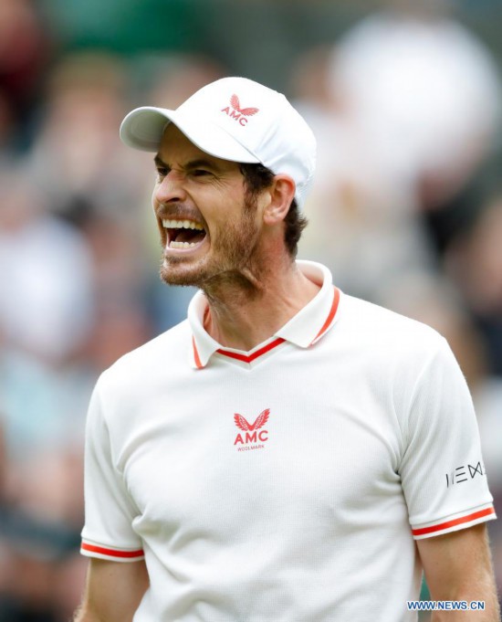 Andy Murry of Britain reacts during the men's singles second round match between Oscar Otte of Germany and Andy Murry of Britain at Wimbledon tennis Championship in London, Britain, on June 30, 2021. (Xinhua/Han Yan)