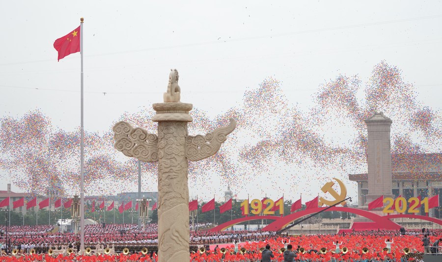 Balloons are released during a ceremony marking the centenary of the Communist Party of China (CPC) at Tian'anmen Square in Beijing, capital of China, July 1, 2021. (Xinhua/Ju Huanzong)