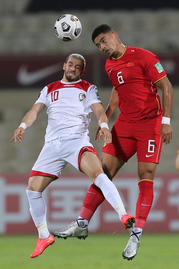 Jiang Guangtai (R) of China vies with Mahmoud AI Mawas of Syria during their Group A match at FIFA World Cup Qatar 2022 and AFC Asian Cup China 2023 Preliminary Joint Qualification Round 2 in Sharjah, UAE, June 15, 2021. (Xinhua)