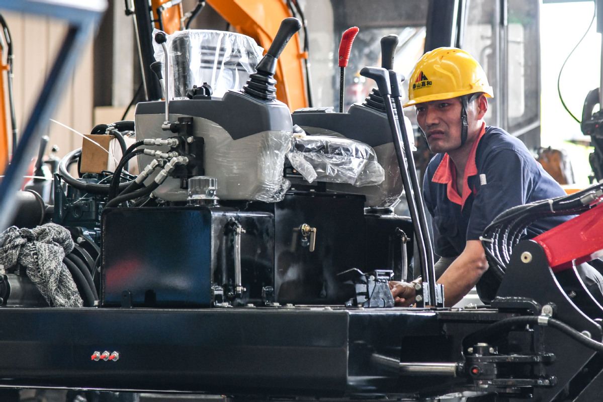 An employee works on the production line of excavators at a machinery manufacturing plant in Tai'an, Shandong province. [Photo/Xinhua]