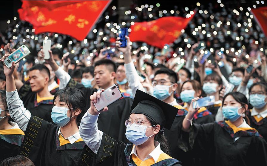 Undergraduates from the Huazhong University of Science and Technology celebrate at their commencement on June 21. [Photo by Ren Yong/for China Daily]