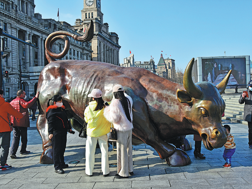 Visitors touch a bull sculpture in hopes of a better market during the Spring Festival holiday in Shanghai on Feb 16, 2021. [Photo/China Daily]