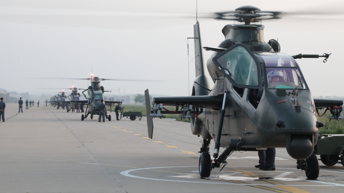 A fleet of Z-19 attack helicopters prepare to take part in an air parade in Beijing on Thursday. A group consisting of five Z-10 and 24 Z-19 helicopters formed the number 100 to pay tribute to the Party's centenary. [Photo/Xinhua]