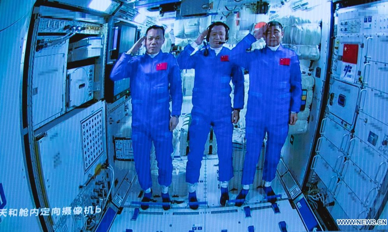 Screen image captured at Beijing Aerospace Control Center in Beijing, capital of China, June 17, 2021 shows three Chinese astronauts onboard the Shenzhou-12 spaceship saluting after entering the space station core module Tianhe. Photo: Xinhua