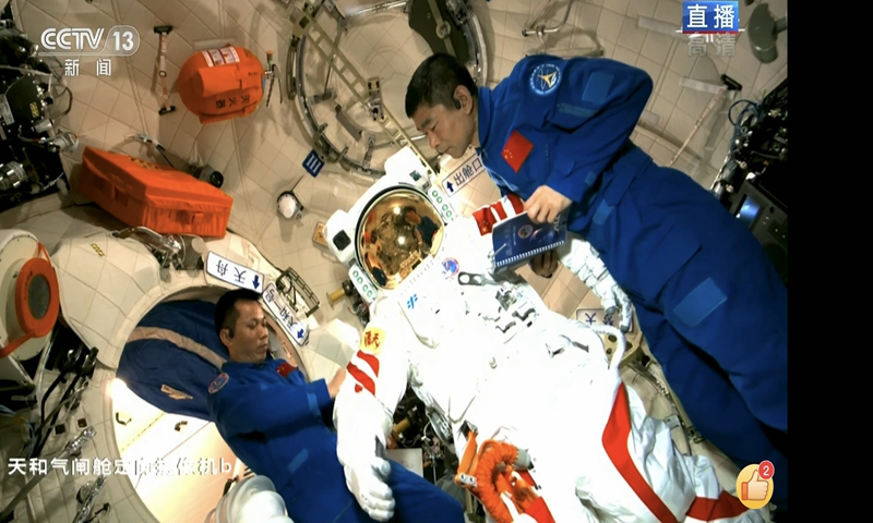 Compared to China's first spacewalk executed by Zhai Zhigang during the Shenzhou-7 mission in 2008, which lasted for some 20 minutes, two of the three Shenzhou-12 crew are expected to remain outside for hours. They will carry out actual space station construction and appliance testing works while outside the cabin, rather than mere technology verification like during Zhai's spacewalk, which will be a highlight but challenging for the crew, Pang Zhihao, a Beijing-based senior space expert and retired researcher from the China Academy of Space Technology, told the Global Times.