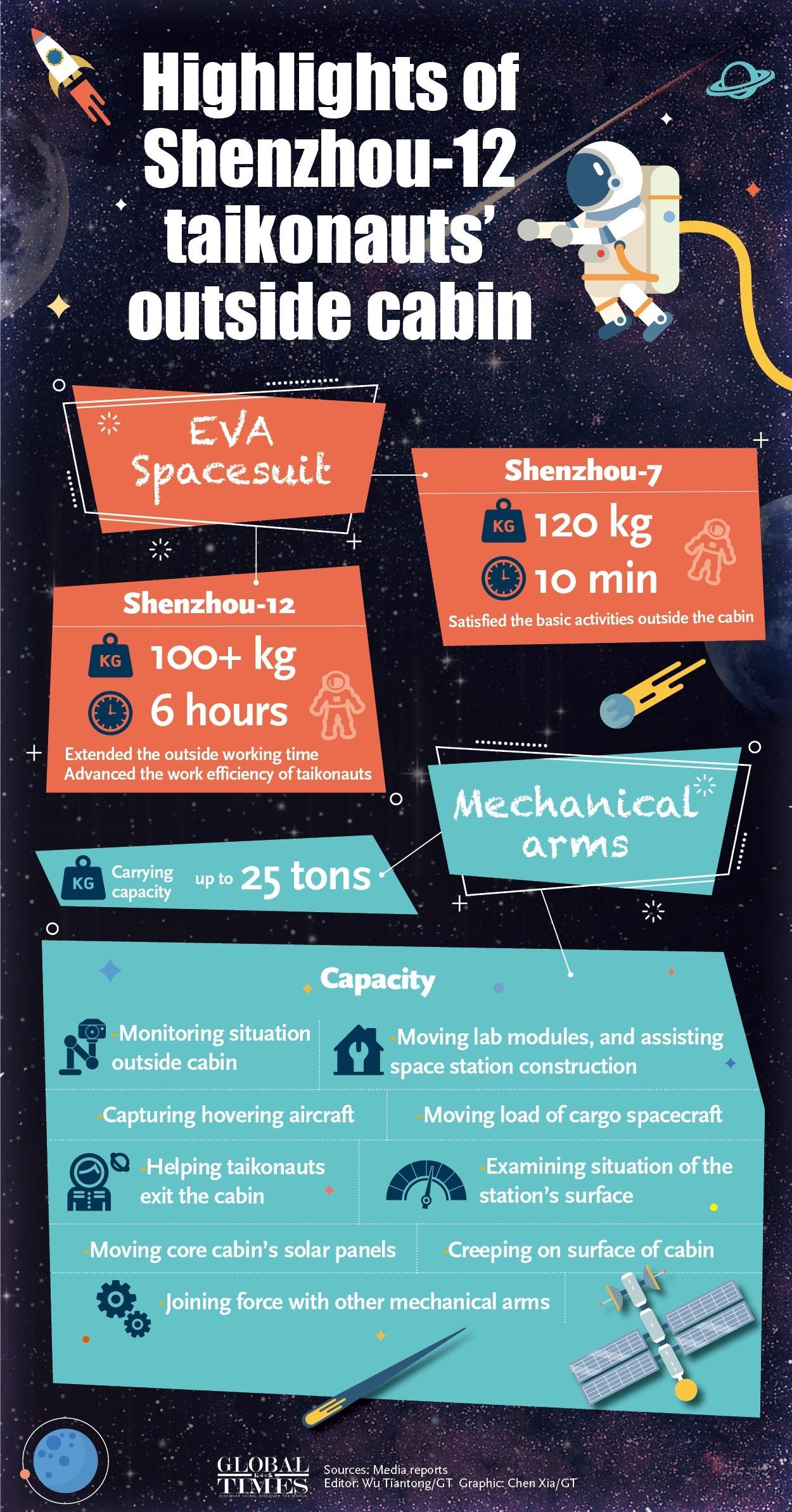 Highlights of Shenzhou-12 taikounauts' outside cabin Infographic: Wu Tiantong/GT
