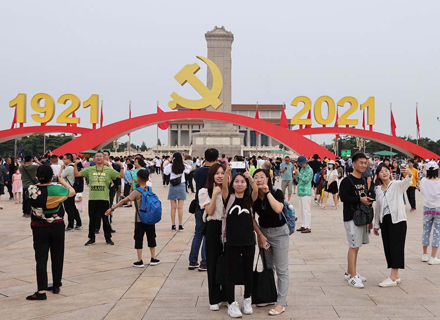 Visitors take photos in Tian'anmen Square in Beijing on Friday after it reopened to the public following the ceremony commemorating the Communist Party of China's centenary on Thursday. FENG YONGBIN/CHINA DAILY