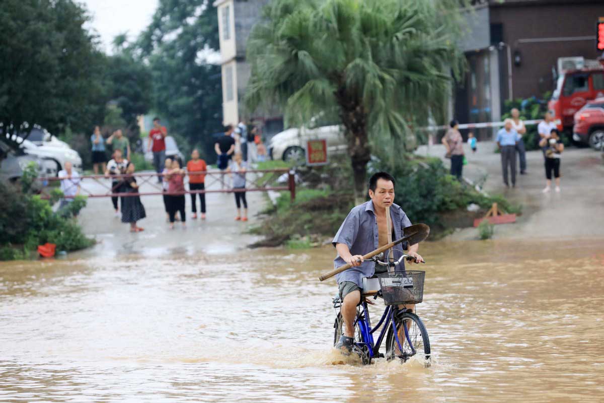 A man rides along a flooded riverbank in Rong'an. [Photo by Tan Kaixing/For China Daily]
