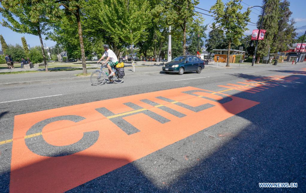 An "Every Child Matters" street mural is seen on Commercial Drive in Vancouver, British Columbia, Canada, on July 3, 2021. The street mural was painted to honor victims and survivors of former indigenous residential schools. (Photo by Liang Sen/Xinhua) |
