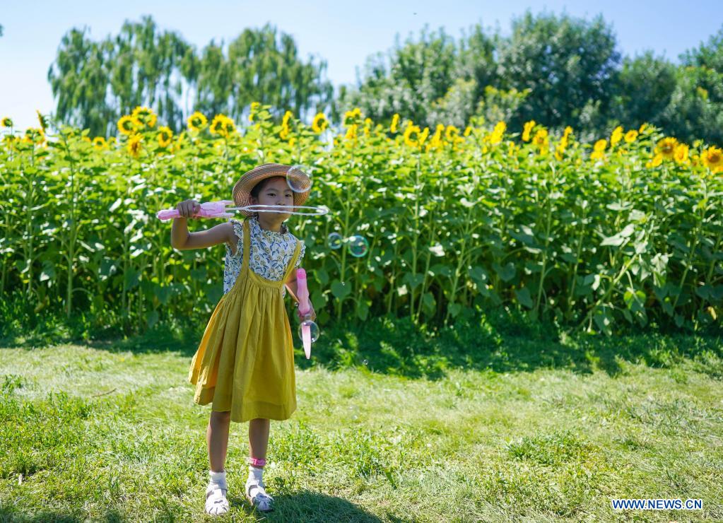 A girl blows bubbles near sunflowers at the Beijing Olympic Forest Park in Beijing, capital of China, July 4, 2021. (Xinhua/Chen Yehua)