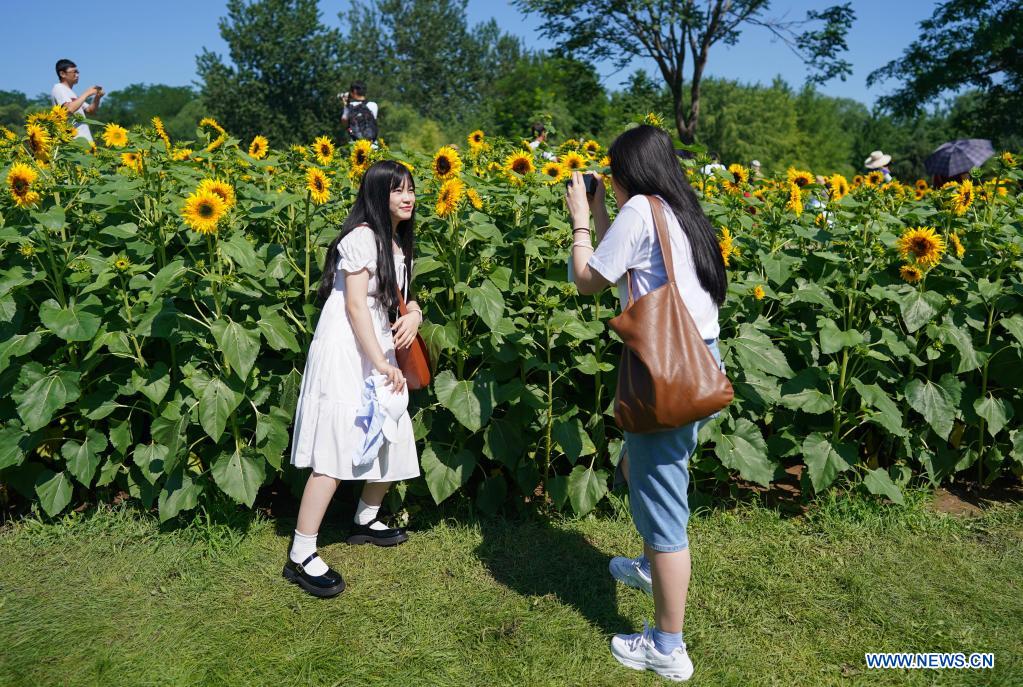 A girl poses for photos with sunflowers at the Beijing Olympic Forest Park in Beijing, capital of China, July 4, 2021. (Xinhua/Chen Yehua)