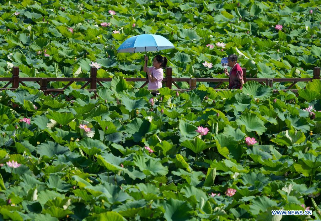 People visit the lotus pond in Suma Village of Baiyunhu in Jinan, east China's Shandong Province, July 3, 2021. (Xinhua/Zhu Zheng)
