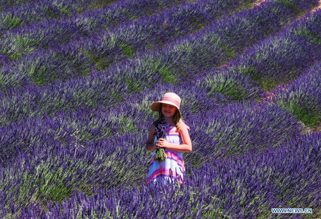A girl enjoys lavender blossoms on the Valensole plateau in Valensole, southern France, July 1, 2021. (Photo by Serge Haouzi/Xinhua)