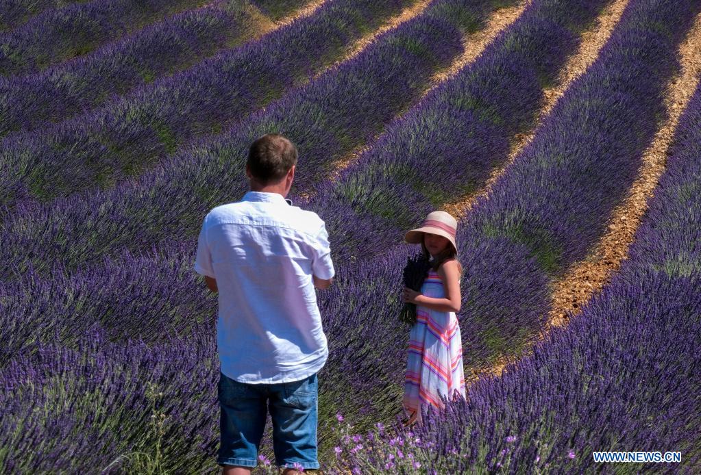 A girl poses for photos among lavender blossoms on the Valensole plateau in Valensole, southern France, July 1, 2021. (Photo by Serge Haouzi/Xinhua)
