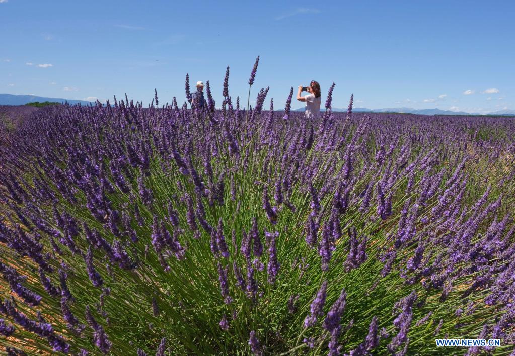 A visitor poses for photos among lavender blossoms on the Valensole plateau in Valensole, southern France, July 1, 2021. (Photo by Serge Haouzi/Xinhua)