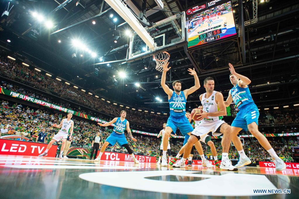 Players compete during the 2020 FIBA Men's Olympic Qualifying Tournament final match between Lithuania and Slovenia in Kaunas, Lithuania, July 4, 2021. (Photo by Alfredas Pliadis/Xinhua)