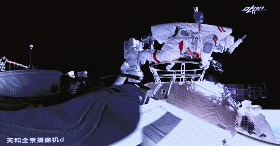 Screen image taken at Beijing Aerospace Control Center on July 4, 2021 shows Chinese astronaut Liu Boming slipping out of the space station core module Tianhe. (Xinhua/Jin Liwang)