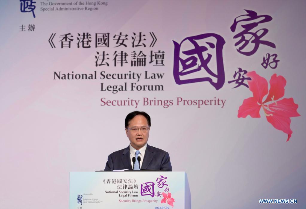 Chen Dong, deputy director of the Liaison Office of the Central People's Government in the Hong Kong Special Administrative Region (HKSAR), addresses a forum entitled "National Security Law Legal Forum -- Security Brings Prosperity" in south China's Hong Kong, July 5, 2021. (Xinhua)