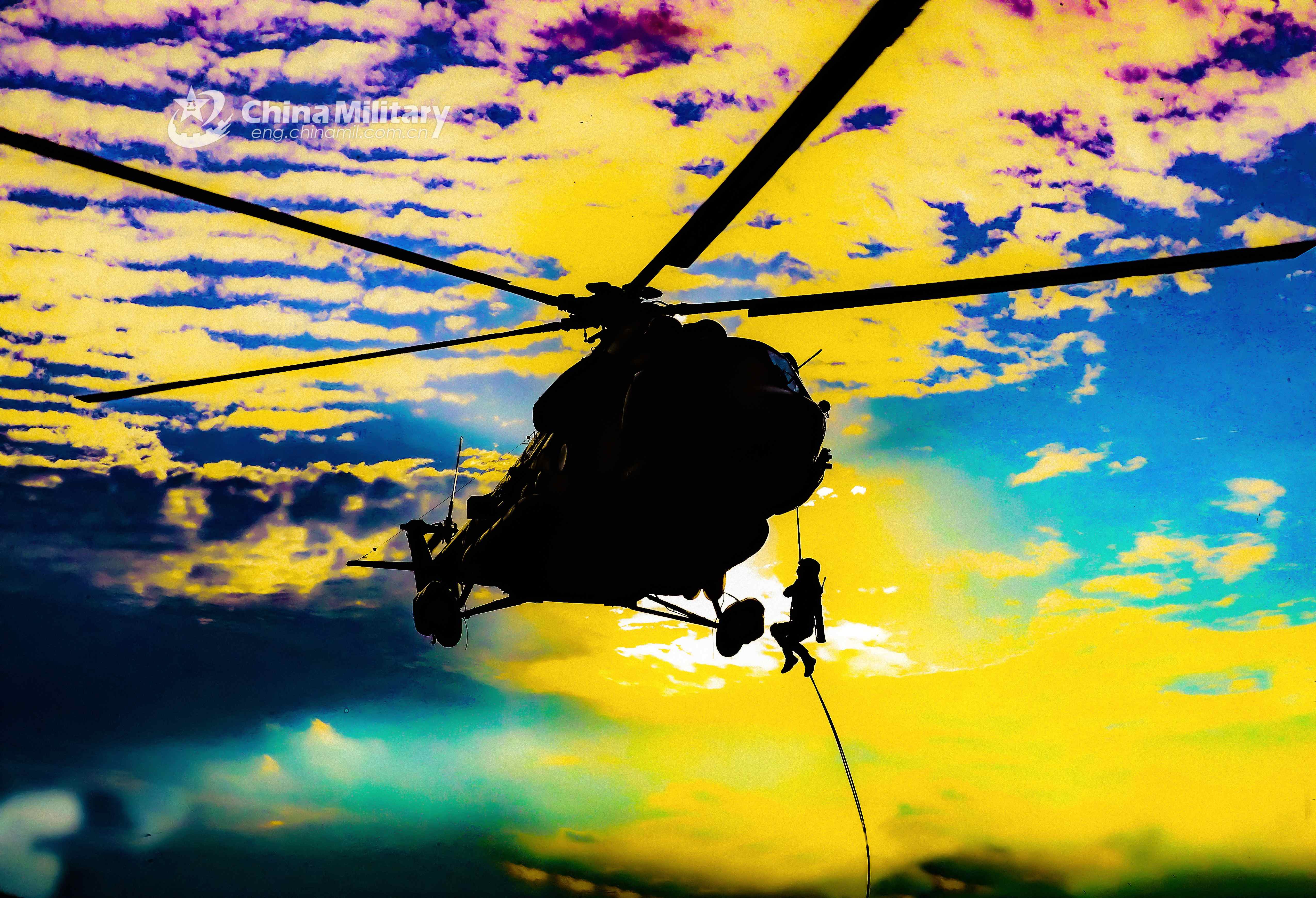 Soldiers assigned to an army aviation brigade under the PLA 71st Group Army practice exiting a transport helicopter during a night fast-roping exercise on June 18, 2021. (eng.chinamil.com.cn/Photo by Zhang Mao)