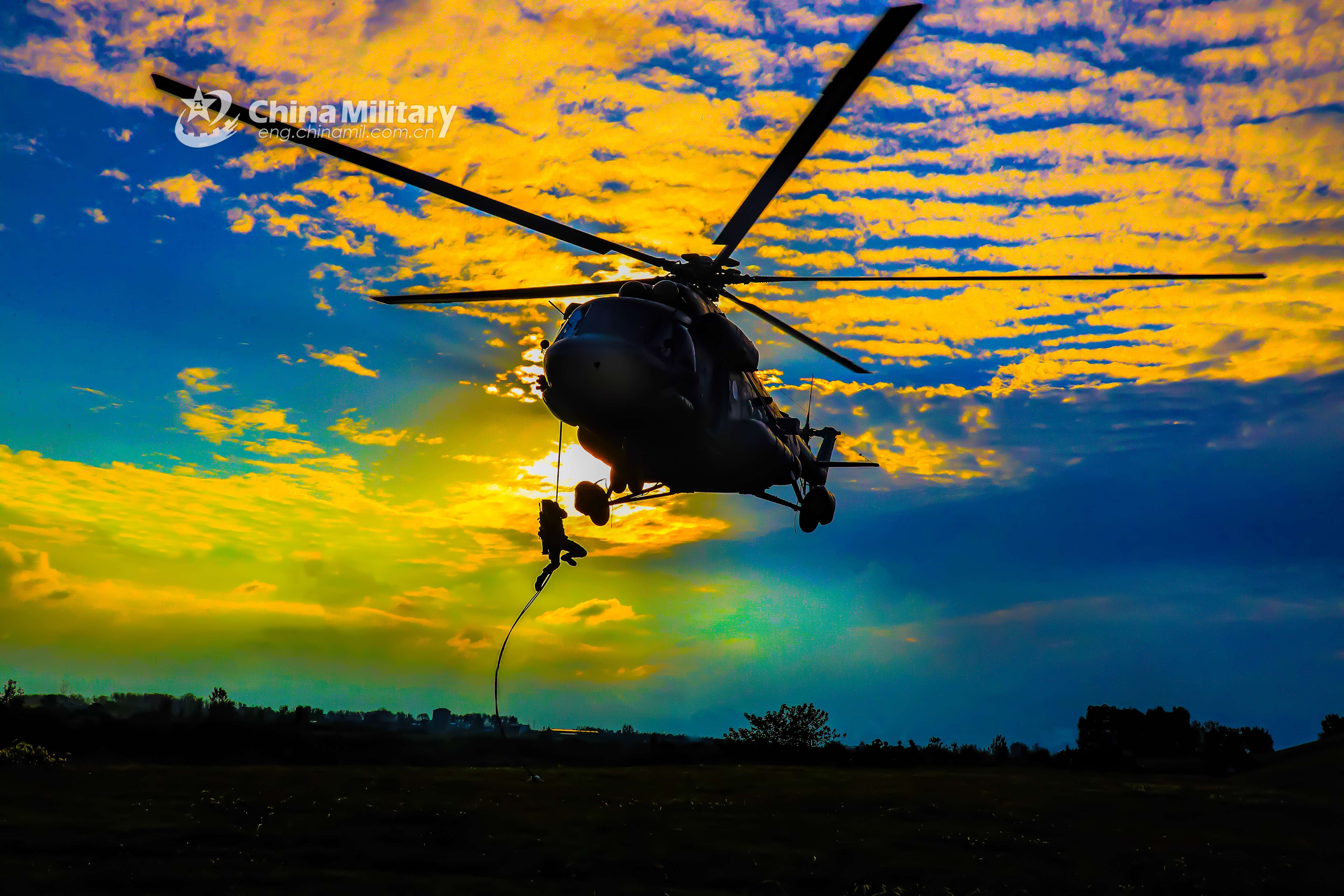 Soldiers assigned to an army aviation brigade under the PLA 71st Group Army practice exiting a transport helicopter during a night fast-roping exercise on June 18, 2021. (eng.chinamil.com.cn/Photo by Zhang Mao)