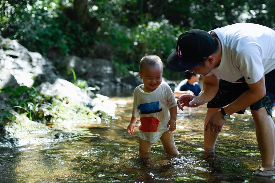A father and his child dabble their feet in a stream to cool off at the Jiuxi scenic spot in Hangzhou, east China's Zhejiang Province, Aug. 3, 2020. (Xinhua/Huang Zongzhi)
