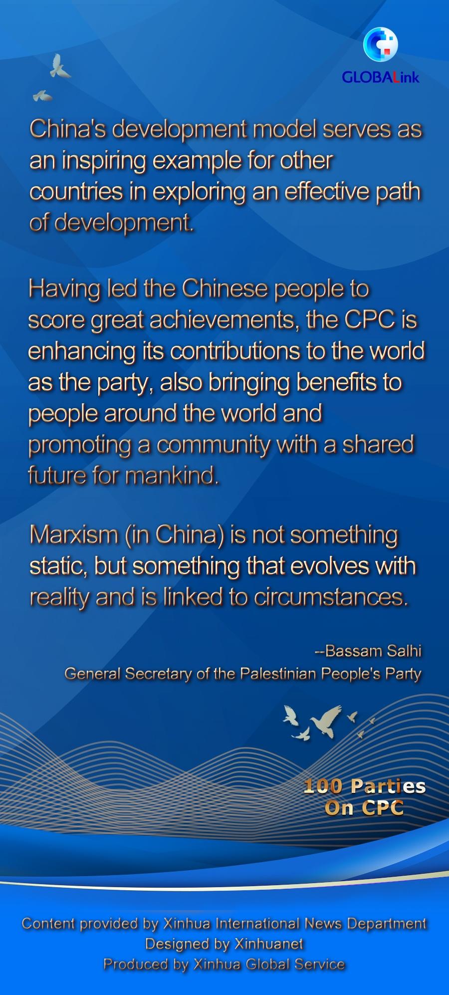 BEIJING, July 7 (Xinhua) -- China's development model serves as an inspiring example for other countries in exploring an effective path of development, said General Secretary of the Palestinian People's Party Bassam Salhi, in a recent interview with Xinhua via video link.