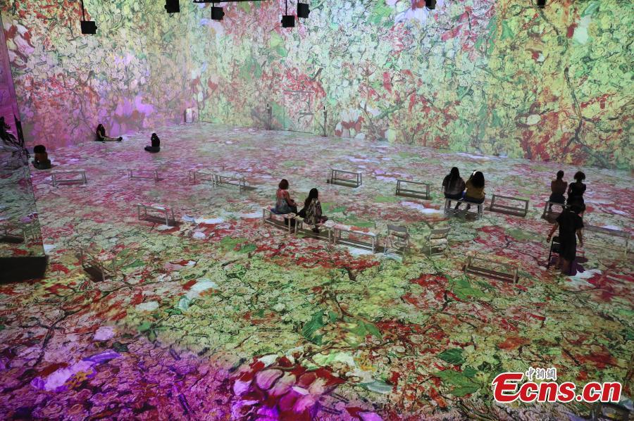 People visit the Van Gogh exhibits in New York City, the U.S. on July 5, 2021. With 500, 000 cubic feet of projections inside, the grand and immersive exhibition turns the artworks of Vincent Van Gogh into dynamic visual images, evoking visitors interests through video and music. (Photo: China News Service/ Liao Pan)