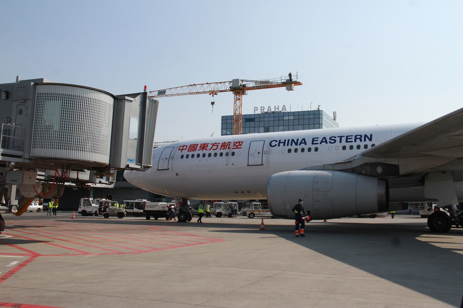 Photo taken on March 20, 2020 shows a plane of China Eastern airlines with medical supplies at the Prague Airport in Prague, the Czech Republic. (Xinhua/Yang Xiaohong)