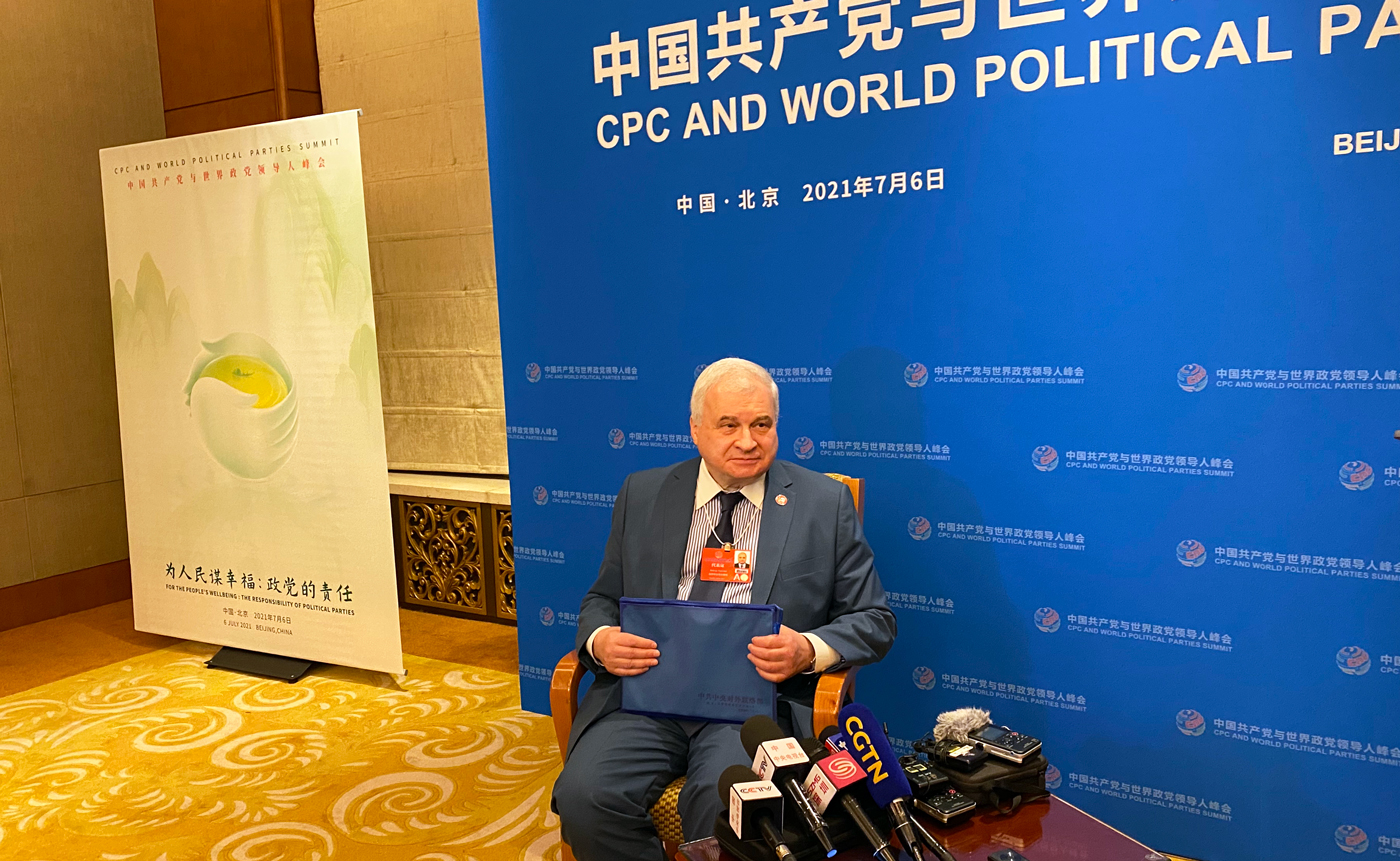 Andrei Denisov, Russian Ambassador to China, answers questions during an interview at the CPC and World Political Parties Summit held in Beijing, July 6, 2021. (People's Daily Online/Meng Bin)