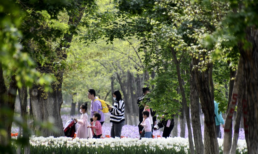 Citizens enjoy the scenery of blooming flowers by Yongding River in Daxing District of Beijing, capital of China, April 24, 2021. (Xinhua/Li Xin)