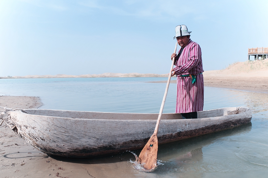 In 2000, a cultural park themed on Lop Nur people’s tradition and art was established in Amudun’s village, turning the once desolate place into a renowned tourist site. Crowds of tourists come to see how Amudun rows his populus canoe, and to taste a traditional dish of the Lop Nur people that he cooks by threading the whole fish onto a skewer made of a salt cedar branch and grilling it on the fire.