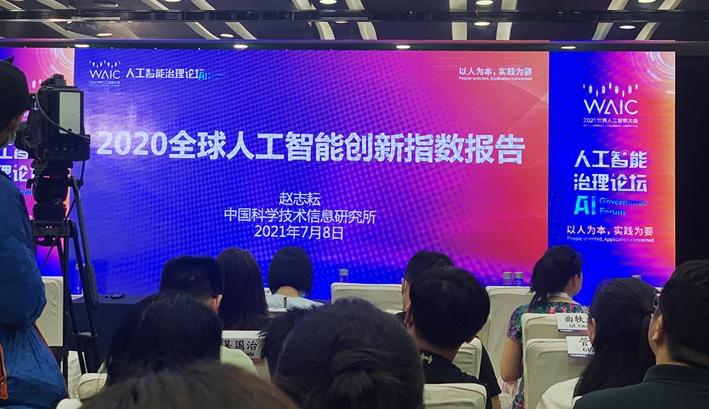 Photo shows the venue for the release of the 2020 Global AI Innovation Index Report during the 2021 World Artificial Intelligence Conference in east China’s Shanghai. (thepaper.cn/Zhu Yiyi)