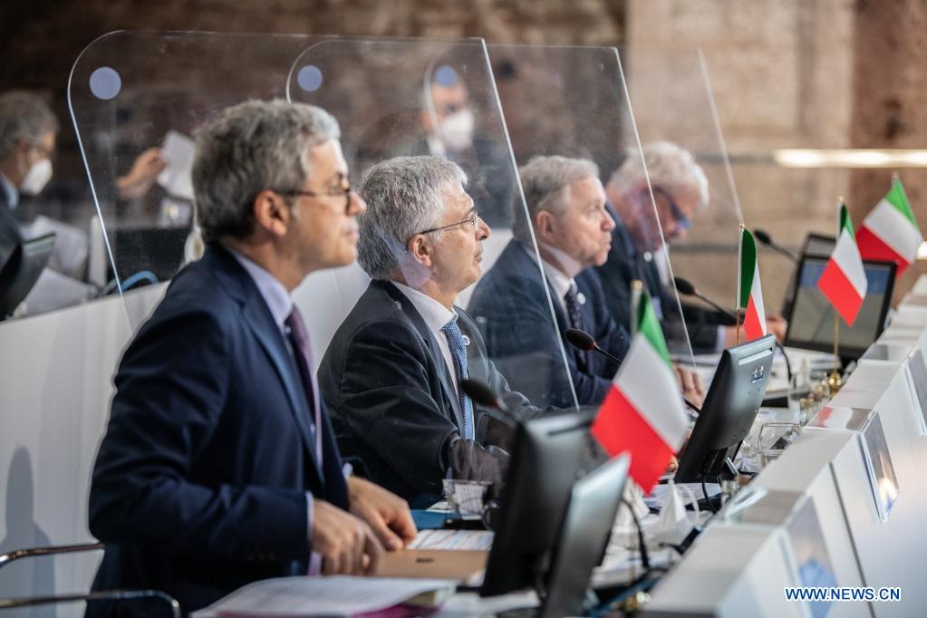 Italian Economy and Finance Minister Daniele Franco (2nd L) attends the G20 finance ministers and central bank governors meeting in Venice, Italy, on July 9, 2021. Finance ministers of the world's 20 largest economies (G20) on Saturday agreed to go ahead with the plan to design a global tax system that would impose a minimum levy on multinational companies. After a two-day meeting in Venice, the G20 finance ministers and central bank governors reaffirmed the common will to reform the international business tax system. (G20 Italy/Handout via Xinhua)