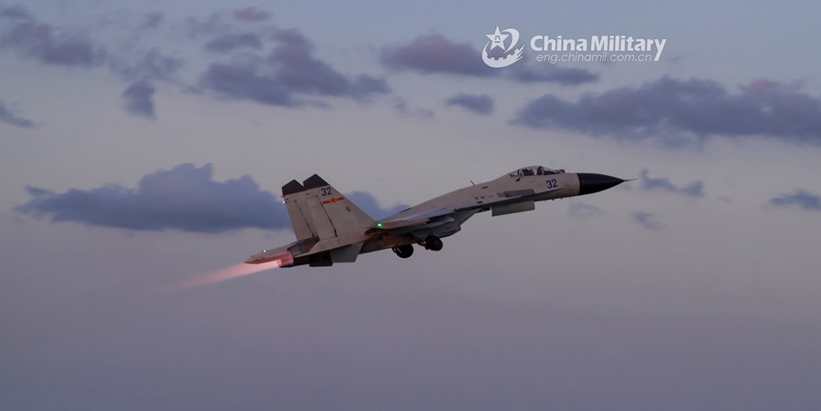 A fighter jet attached to an aviation brigade with the navy under the PLA Southern Theater Command takes off from the runway during a 24-hour flight training exercise. The round-the-clock training exercise focused on subjects including free aerial combat, seizing air-superiority operation, and assault covering operation. (eng.chinamil.com.cn/Photo by Gao Hongwei)