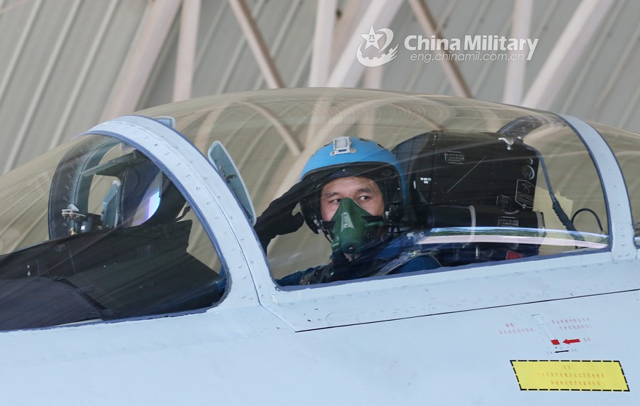 A pilot sitting in the cockpit of his fighter jet salutes to the ground crew before takeoff during a recent flight training exercise organized by an aviation brigade with the navy under the PLA Southern Theater Command. The round-the-clock training exercise focused on subjects including free aerial combat, seizing air-superiority operation, and assault covering operation. (eng.chinamil.com.cn/Photo by Deng Zeming)