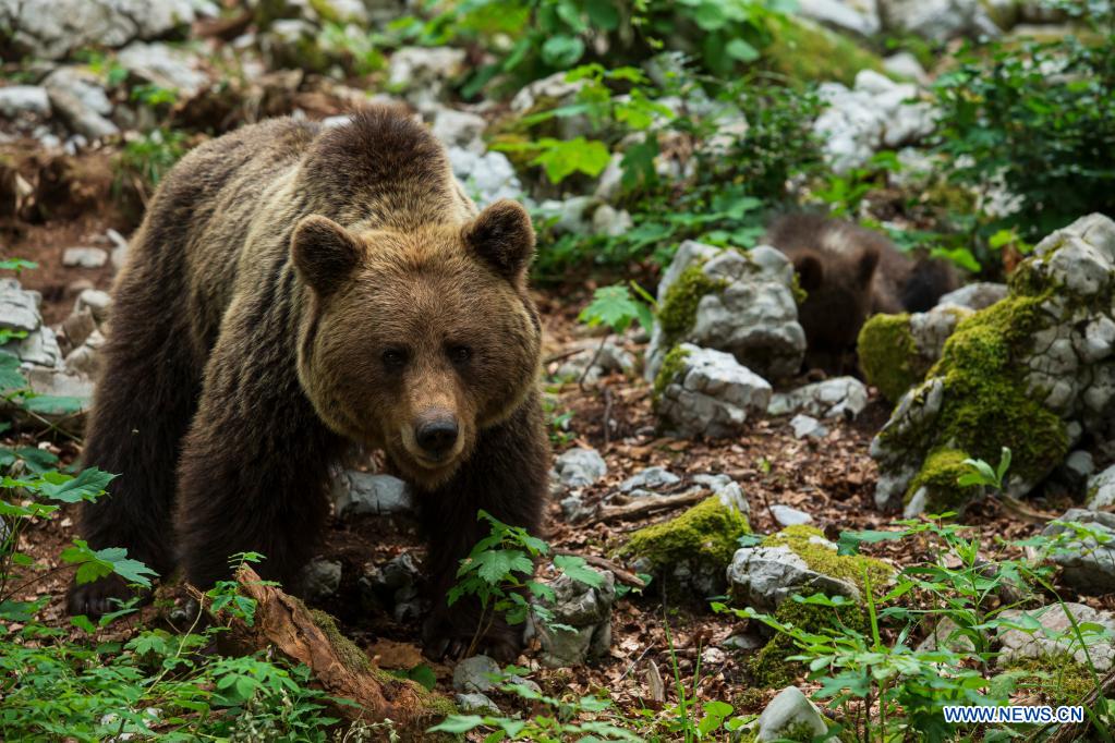 Photo taken on July 8, 2021 shows two brown bears foraging in the forest in Notranjska Region, Slovenia. Wild Bear Watching from the Hides is run by Slovenian young man Miha Mlakar from Stari trg pri Lozu in Notranjska, south Slovenia's region. He already has eight locations with built hides where tourists, journalists and others can watch bears in the wild from short distance. Slovenia has a high population density of brown bears in Europe. (Photo by Zeljko Stevanic/Xinhua)