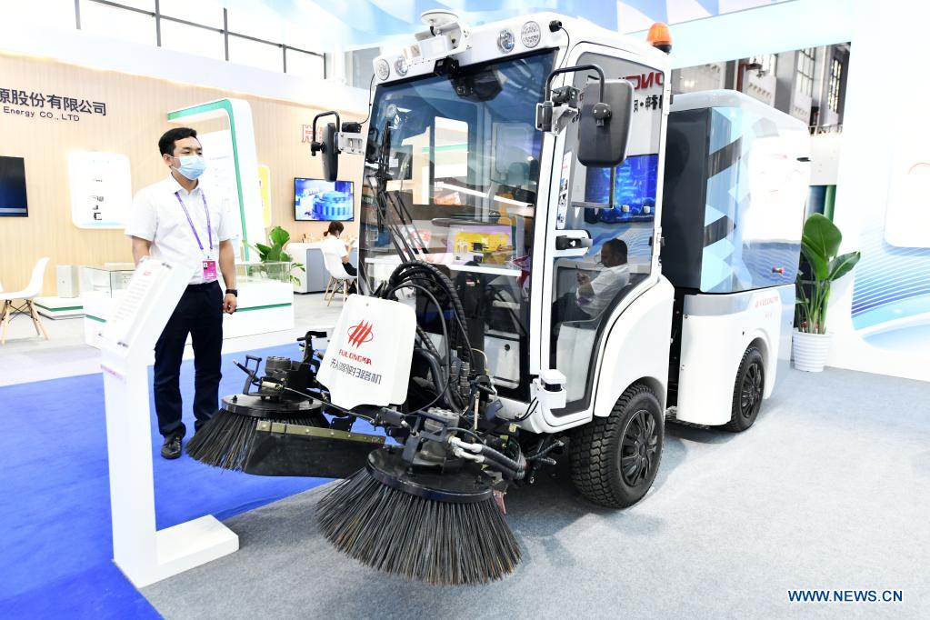 An exhibitor shows a pilotless sweeper at Eco Forum Global Guiyang 2021 in Guiyang, capital of southwest China's Guizhou Province, on July 12, 2021. China's only national-level global forum themed on ecological civilization, Eco Forum Global Guiyang 2021, opened on Monday in Guiyang. The two-day conference, centering on the country's green and low-carbon transition to build a community of life for humans and nature, will witness a range of online and offline activities. (Xinhua/Yang Wenbin)