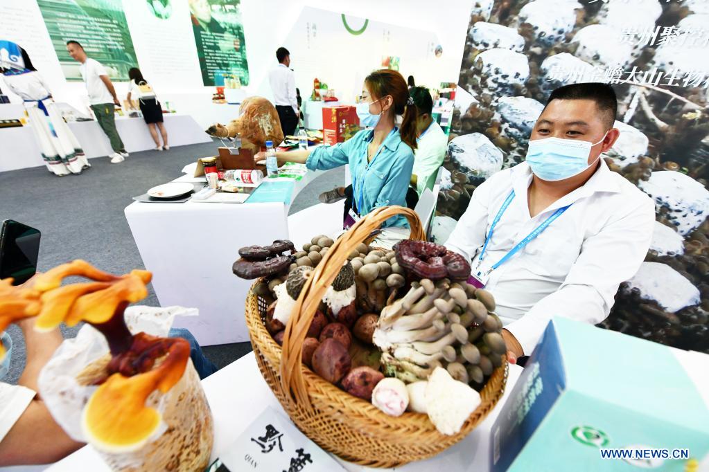 Edible mushrooms are displayed by an exhibitor at Eco Forum Global Guiyang 2021 in Guiyang, capital of southwest China's Guizhou Province, on July 12, 2021. China's only national-level global forum themed on ecological civilization, Eco Forum Global Guiyang 2021, opened on Monday in Guiyang. The two-day conference, centering on the country's green and low-carbon transition to build a community of life for humans and nature, will witness a range of online and offline activities. (Xinhua/Yang Wenbin)