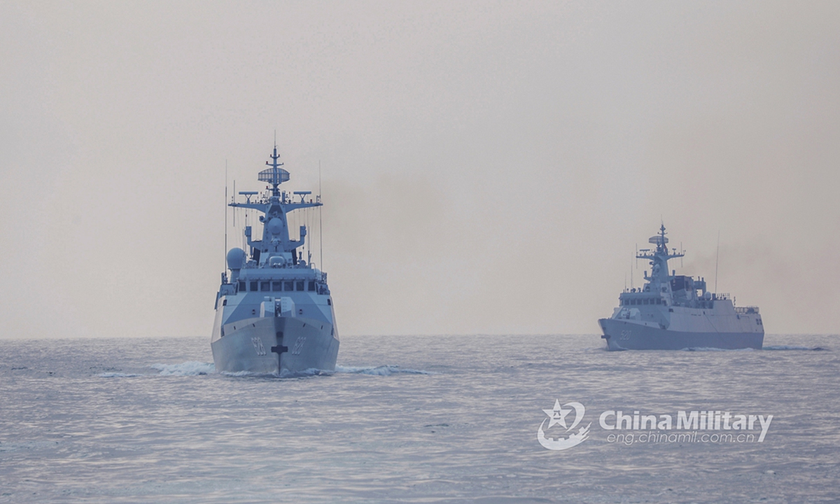 Two warships attached to a naval frigate flotilla under PLA's Southern Theater Command carry out coordination drill during a maritime combat training exercise on April 21, 2021. (Photo/China Military Online)