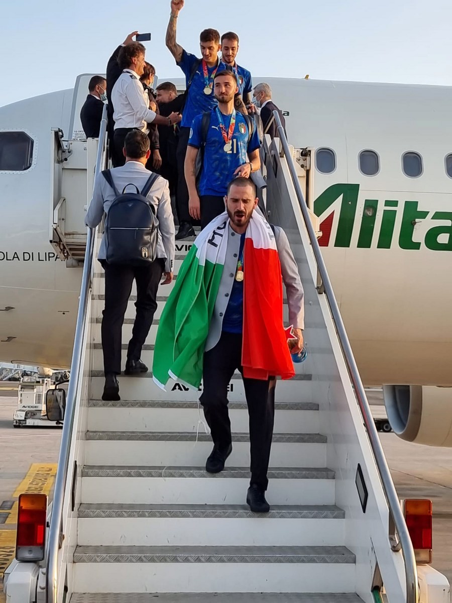Photo taken on July 12, 2021 shows Italian football team members arriving at Fiumicino Airport after winning the final over England at the UEFA EURO 2020 in Rome, Italy. (Xinhua)