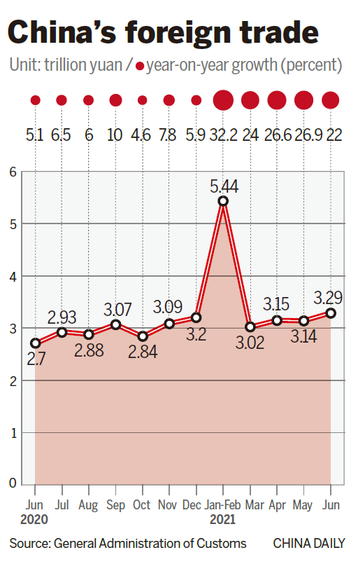 China's foreign trade climbed by 27.1 percent year-on-year to 18.07 trillion yuan ($2.8 trillion) during the first half of 2021, driven by robust demand due to the rapid recovery in major economies and the fast growth of cross-border e-commerce, statistics from the General Administration of Customs showed on Tuesday.