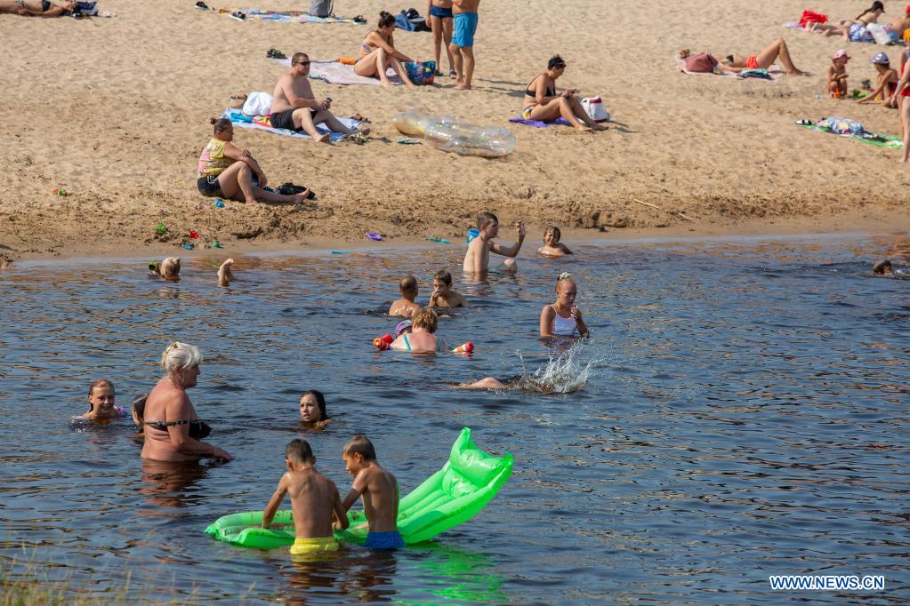 People cool themselves in a river in Riga, Latvia, on July 13, 2021. The Latvian Environment, Geology and Meteorology Center has issued a red heat warning in the country, which is in effect until Friday. (Photo by Edijs Palens/Xinhua)
